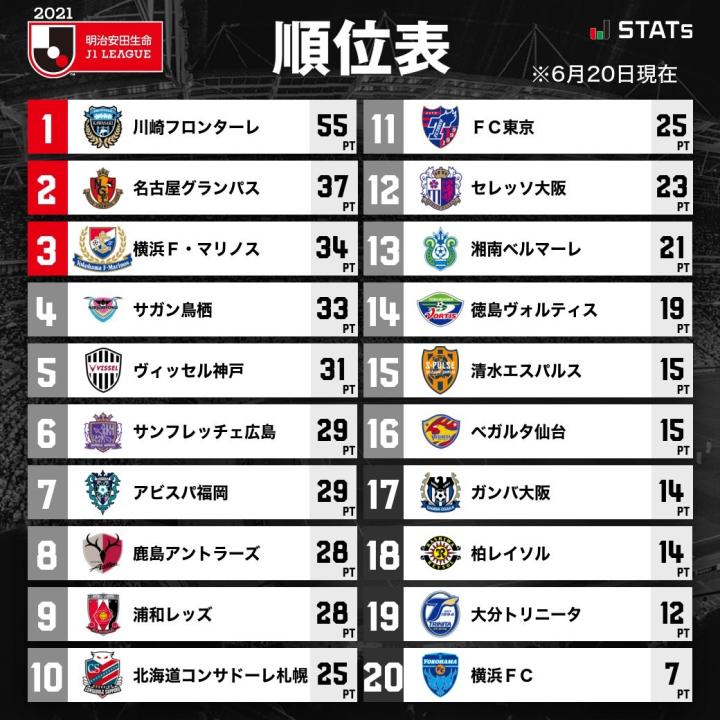 北京时间6月20日,2021赛季J1联赛第18轮的大部分比赛结束。鹿岛鹿角1-1战平仙台七夕,胡安-阿拉诺绝平;浦和红钻2-3遭湘南比马绝杀,容克尔双响难救主;神户胜利船客场2-1击败福冈黄蜂,伊涅斯塔点射制胜,打入本赛季联赛首球。