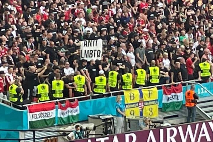 布达佩斯普斯卡什球场内匈牙利球迷反对性别多元化的标语
