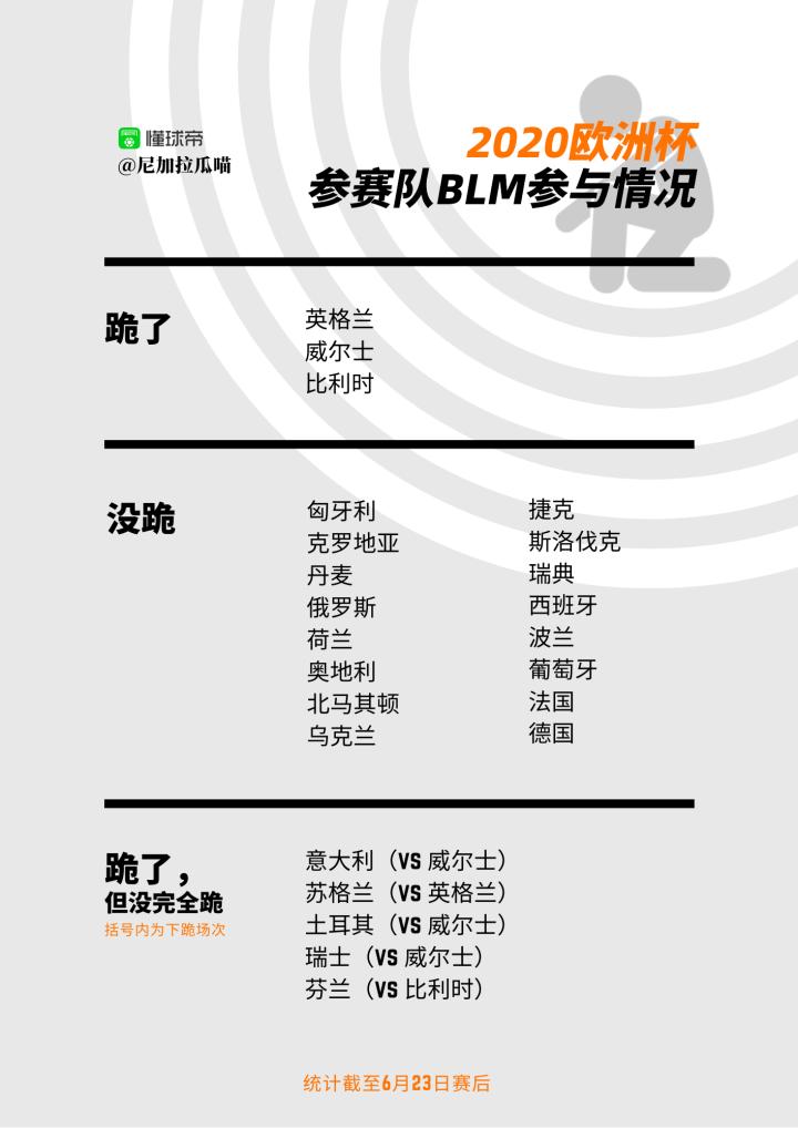 意大利对阵土耳其的揭幕战,双方在哨响后直接开球;第二场威尔士vs瑞士,两队则在赛前有跪地环节……根据我的统计,本届欧洲杯24支球队在小组赛阶段就下跪与否分成了三个派别,分别是下跪派、不跪派和骑墙派: