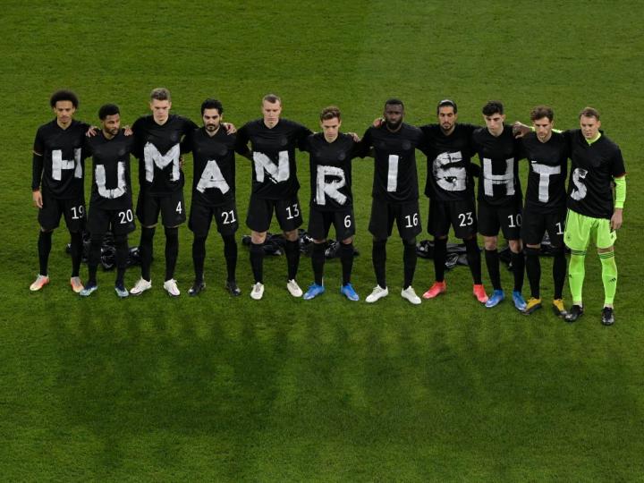 今年早些时候的一场世界杯预选赛上,德国队首发11人就身穿印有“HUMAN RIGHTS(人权)”字样的黑T恤,来抗议2022年卡塔尔世界杯在筹办阶段存在的劳工伤亡。而在那次事件中,FIFA也进行了调查,并在之后表态称不会对此进行处罚,因为“国际足联相信言论自由、坚信足球拥有向善的力量”。