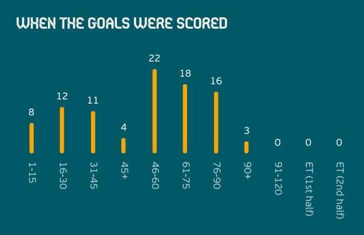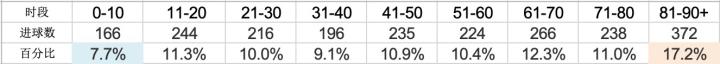 尽管我们总是对比赛尾声的绝杀进球印象深刻,但从统计学角度来说,如果以5分钟为区间长度,从第10-15分钟开始统计(开场前10分钟进球确实少),进球在各个时间段的分布是相对均匀的,并不存在所谓的“高峰期”。