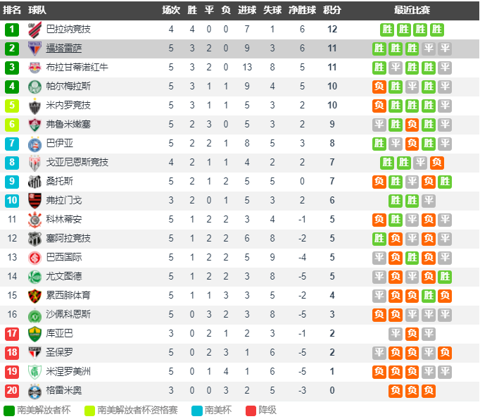 布拉甘蒂诺红牛3-2强势击败卫冕冠军弗拉门戈;桑托斯2-0击败圣保罗,送对手5轮不胜;巴拉纳竞技2-1力挫戈亚尼恩斯竞技,开季4战全胜,升至积分榜第一;尤文图德1-0击败累西腓体育,取得新赛季首胜;格雷米奥本轮比赛延期,目前少赛2轮积0分继续垫底。