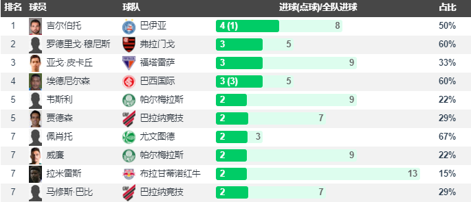 巴伊亚中锋吉尔伯托以4球继续保持榜首;弗拉门戈前锋穆尼斯凭借本轮梅开二度,以3粒进球来到射手榜第二梯队;韦斯利、贾德森等球员以2粒进球紧随其后。