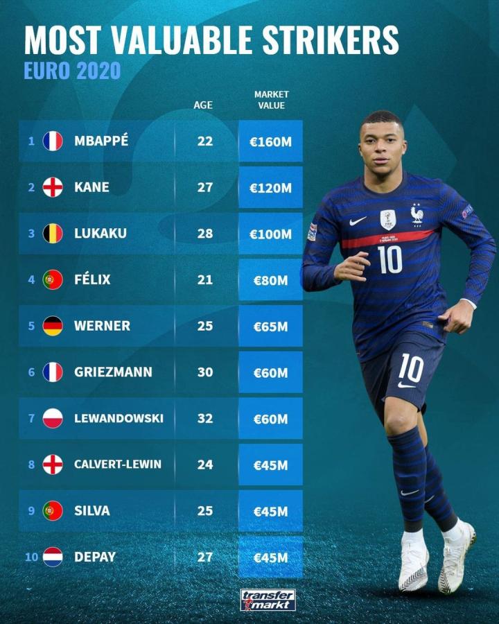 德国转会市场网站盘点了本届欧洲杯的前锋身价榜,法国球星姆巴佩以1.6亿欧居首,凯恩和卢卡库分列二、三位。