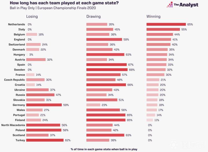 其他球队方面,荷兰队是所有球队中领先时长最多的,达到65%,意大利也有55%的时间处于领先。此外,有4支球队从未领先过,分别是北马其顿、波兰、苏格兰和土耳其。