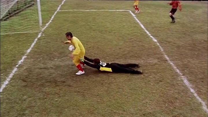图中可以看到,少林足球队的比赛服为土黄色,而四师兄“鬼影擒拿手”的门将服也是黄色,虽然颜色上有一定区别,但按照规则,为了场上裁判更容易辨认守门员,这样色差不大的衣服是不合乎规范的,此外,少林足球队员们上场似乎都是没有佩戴护腿板的(目测),这一条也是违规的。