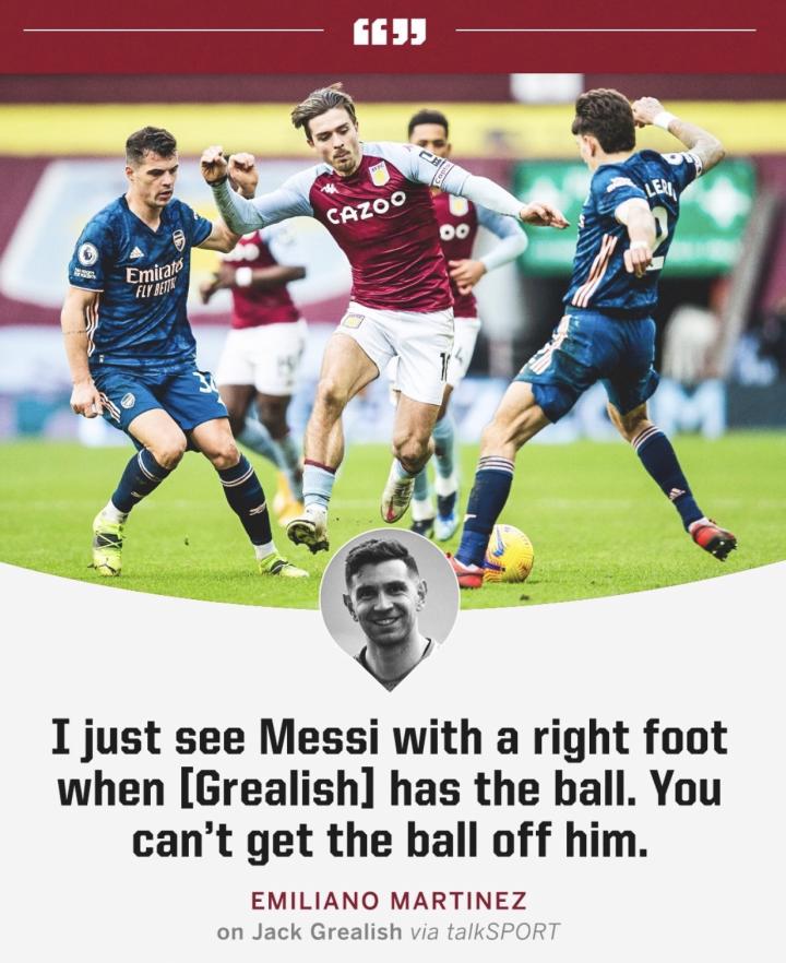 (espn)怪不得瓜帅好这口! 阿斯顿维拉门将马丁内斯在接受talkSPORT采访时谈格拉利什, “当格拉利什控球时,我仿佛看到了梅西的影子。” “你无法从他脚下抢走皮球。” No wonder Pep likes him. "I just see Messi with a right foot when he has the ball." "You can't get the ball off him." -Emiliano Martinez on Jack Grealish via talkSPORT ESPN(来源) https://plus.espn.com/(地址)