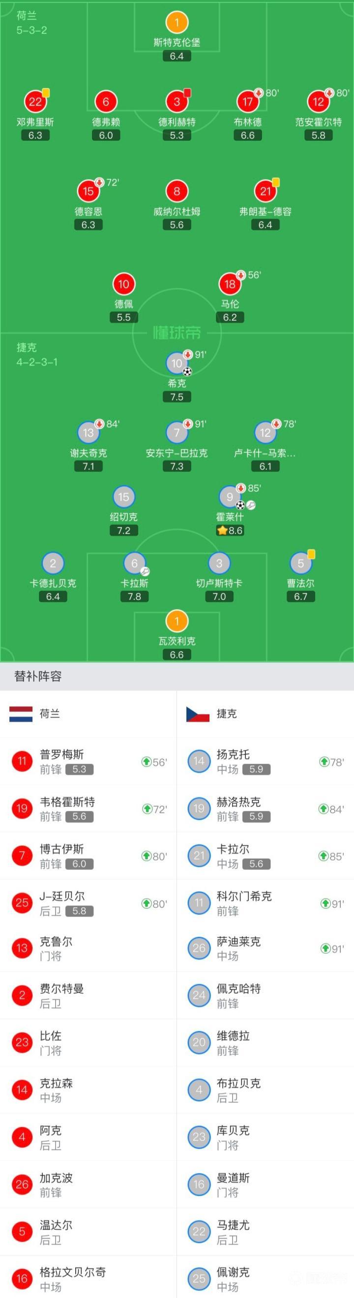 荷兰首发:1-斯特克伦堡、22-邓弗里斯、3-德利赫特、6-德弗赖、17-布林德(80`25-J-廷贝尔)、12-范安霍尔特(80`7-博古伊斯)、21-弗朗基-德容、15-德容恩(72`19-韦格霍斯特)、8-威纳尔杜姆、10-德佩、18-马伦(56`11-普罗梅斯)