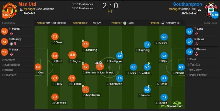 本场比赛,完成首秀表现出色的博格巴获得全场最高的8.5分,梅开二度的伊布则获得8.3的高分。