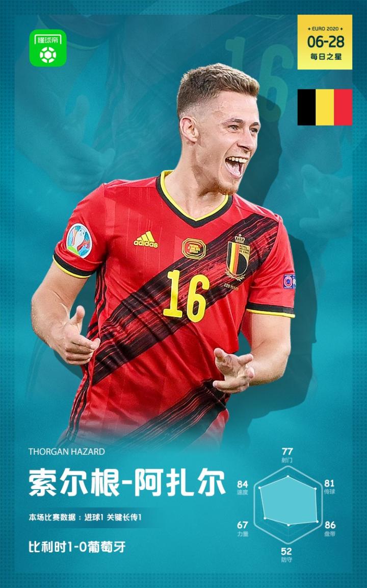 6月28日的欧洲杯今日之星颁给比利时攻击手索尔根-阿扎尔。他在比利时对阵葡萄牙的比赛中打进了制胜一球,帮助比利时战胜强敌,继续前进。