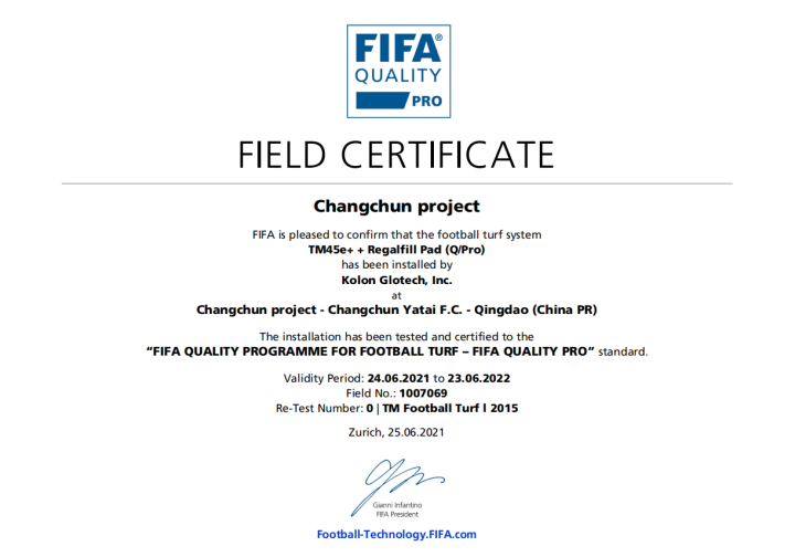 等待了近两个月,亚泰净月基地室内足球场的人造草坪顺利通过国际足联的检测,获得了国际足联足球人工草坪质量与安全认证体系中的最高级别认证FIFA Quality Pro,同时还获得了国际足联官方授权检测机构的检测报告,成为长春市唯一国际足联认证标准场地。