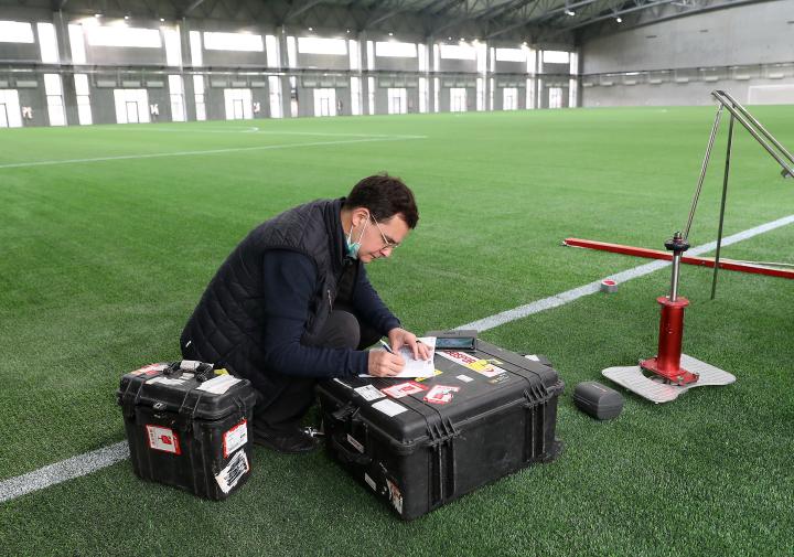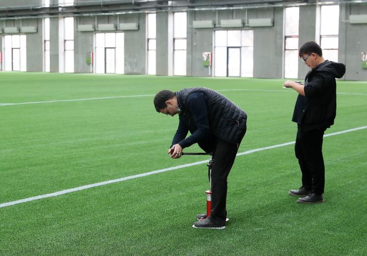 4月29日,国际足联检测机构法国LABOSPORT公司驻中国实验室对亚泰净月基地室内馆人工草皮进行检测