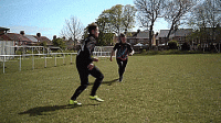 然后我们要第二次触球,用惯用脚的外侧,我要向相反的方向触球,爆发突破。我们要尽量减少两次触球之间的时间,为了做到这一点,我们要练习触球穿过身体,然后把球踢出去,确保我们一直把球放在我们的前面。