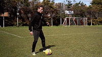 第一步拿球后,用我们的惯用脚脚内侧向身体内侧轻轻触球。