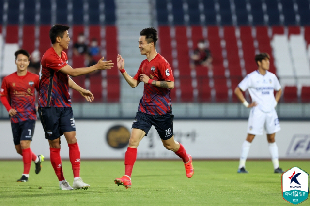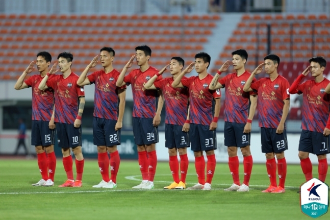 金泉尚武在2021赛季的六月前三场比赛保持全胜,积分榜也杀入到了三甲。这场与忠南牙山FC的对决,球队只希望能够赢球。赛前,刚刚新入伍的球员来到了现场观战,他们也希望见证这场胜利。本场比赛,金泉尚武的进球来得非常快,仅仅1分钟,朴东辰就抓住对手门将李起现的失误,将球射入球网。金泉尚武1-0领先。