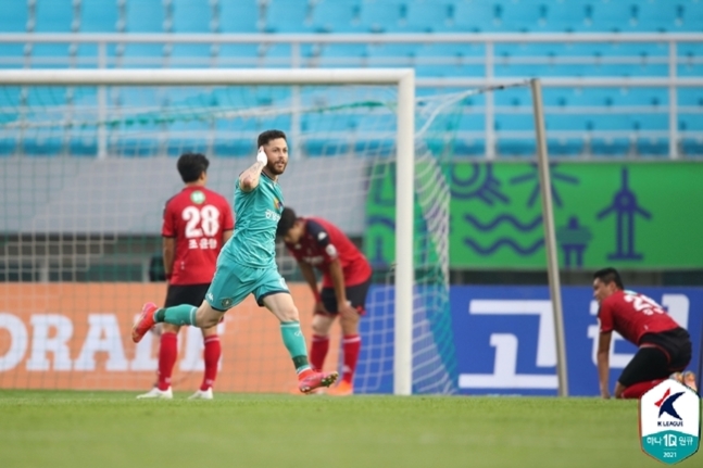 我们再把目光聚焦到韩国安山。周中在补赛中刚刚2-0击败忠南牙山FC的安山Greeners此番回到主场,迎战排名垫底的富川FC1995。本场比赛,也是本轮最精彩的一场对决。占据主场优势的安山全力进攻,而富川则是反击。这种你来我往的态势下,僵局还是被主攻的一方打破。第28分钟,安山打出精妙配合,中卫延济民在中场拿球后带球一路突破,他看到队友崔建柱完成传球,后者又交给了外援杜亚尔特,巴西前锋起左脚打破僵局,1-0!这也是杜亚尔特连续两场比赛打入的第二球。