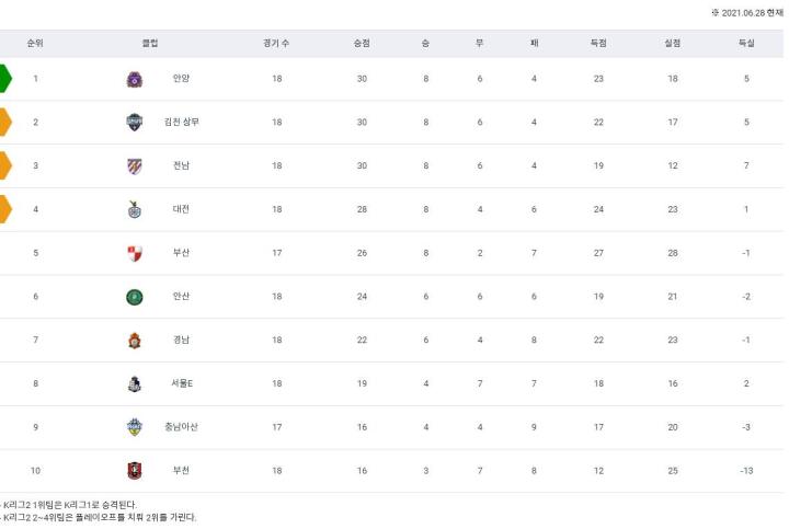 韩国足球新闻韩国当地时间6月26~28日,2021赛季韩国足球K2联赛第十八轮展开争夺。这一轮五场比赛,共有四场比赛产生进球,其中在韩国安山,安山Greeners在2球领先的情况下,最终被对手完成翻盘,2-2痛失三分。而在韩国金泉,许榕埈的梅开二度帮助球队最终3-1力克对手忠南牙山FC,整个六月保持全胜。而这个战绩,也让他们追平了本轮战平的领头羊FC安养,只是在进球数方面少,但也足够威胁到领头羊的位置。下面我们就来看一下本轮的情况。