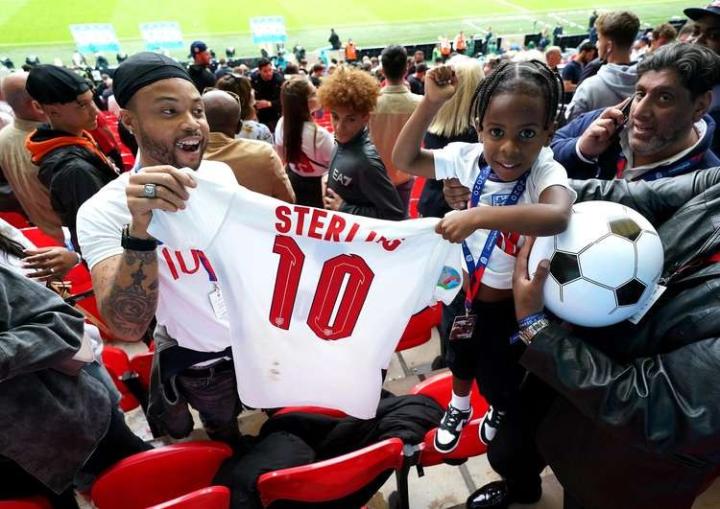 照片中斯特林的家人和他的小儿子蒂亚戈在比赛现场看台上,身穿斯特林的英格兰队10号球衣。小蒂亚戈做出了六的手势,还举起双臂展示球衣背面。看起来一家人为斯特林的表现异常开心。