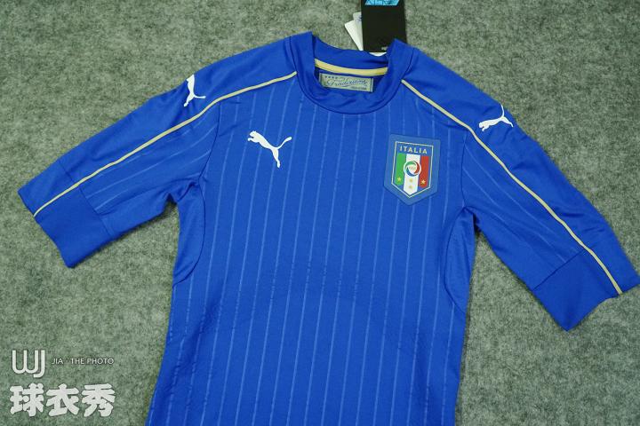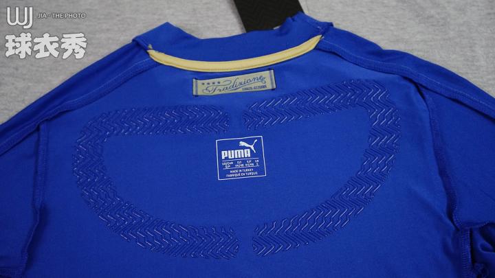 高圆领的设计参考了意大利队过去曾经穿过的经典球衣,在时尚的今天保持着古典的韵味。肩部和袖子上有彪马经典的Form Strip条纹、金色的镶边。