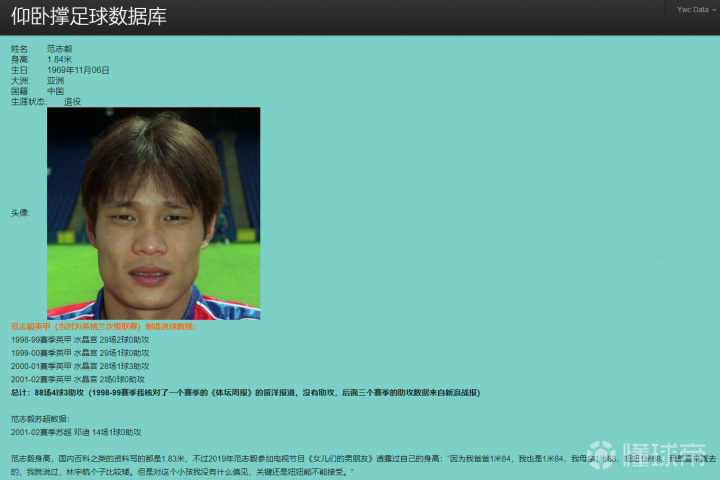 范志毅英甲(当时为英格兰次级联赛)制造进球数据: 1998-99赛季英甲 水晶宫 29场2球0助攻 1999-00赛季英甲 水晶宫 29场1球0助攻 2000-01赛季英甲 水晶宫 28场1球3助攻 2001-02赛季英甲 水晶宫 2场0球0助攻 总计:88场4球3助攻(1998-99赛季我核对了一个赛季的《体坛周报》的留洋报道,没有助攻,后面三个赛季的助攻数据来自新浪战报) 范志毅苏超数据: 2001-02赛季苏超 邓迪 14场1球0助攻