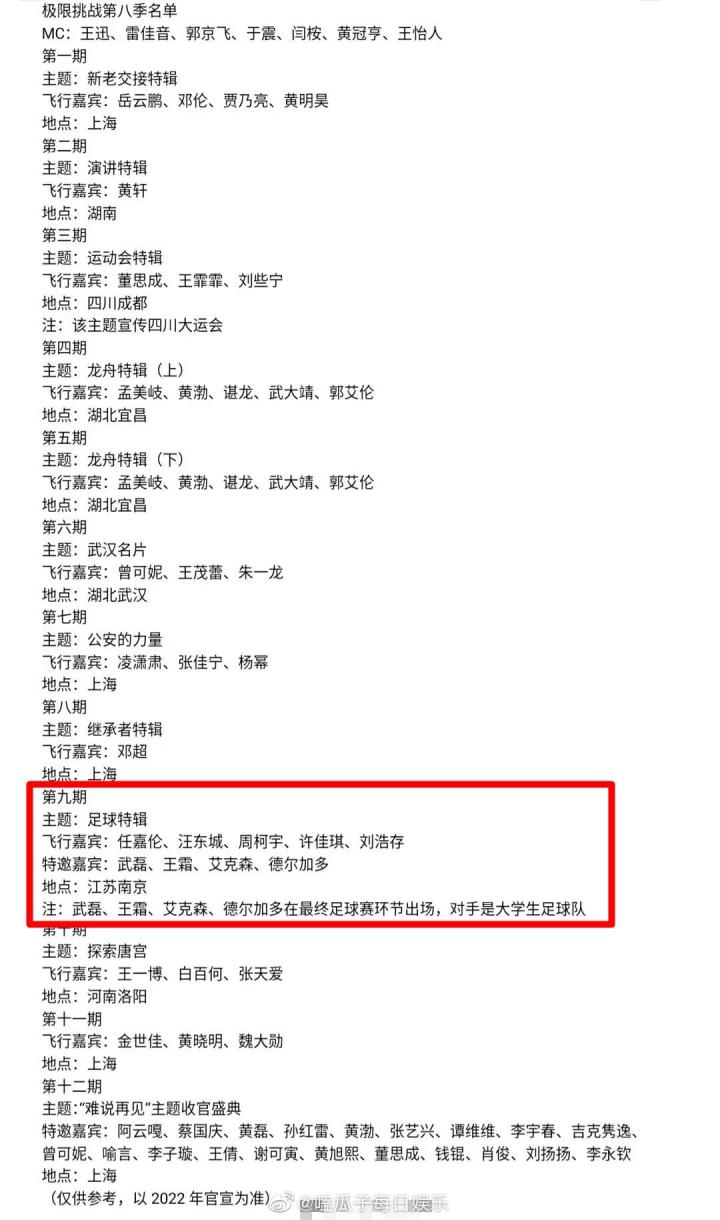 网传极限挑战第八季名单,武磊王霜艾克森和德尔加多将参加Ba1ma @懂球帝2021-07-04 10:38据网络上曝光的综艺节目《极限挑战第八季》的名单,武磊、艾克森、王霜和德尔加多将会参加第九期的节目。根据这份曝光的名单,本季节目第九期是足球特辑,将在江苏南京录制,武磊、艾克森、王霜和德尔加多将作为特邀嘉宾参加本期节目,与大学生足球队进行一场友谊赛。除了足球运动员外,第四、五期龙舟特辑中,还可以看到羽毛球运动员谌龙,短道速滑运动员武大靖和篮球运动员郭艾伦。展开更多