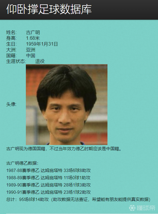 古广明德乙数据:1987-88赛季德乙 达姆施塔...仰卧撑邱翼曦 @懂球帝2021-07-05 14:51古广明德乙数据: 1987-88赛季德乙 达姆施塔特 33场6球8助攻 1988-89赛季德乙 达姆施塔特 11场0球1助攻 1989-90赛季德乙 达姆施塔特 28场1球3助攻 1990-91赛季德乙 达姆施塔特 23场1球2助攻 总计:95场8球14助攻(助攻数据无法查证,希望能有朋友能提供真实数据) 古广明现为德国国籍,不过当年效力德乙时期应该是中国籍。展开更多
