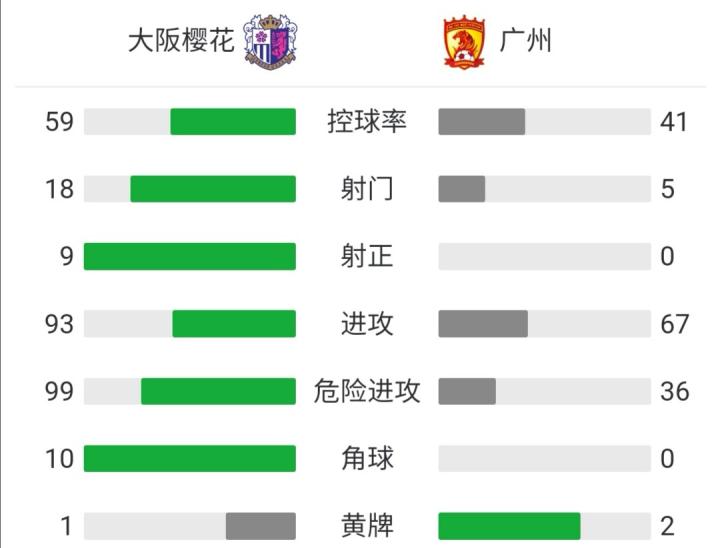 广州0-5大阪樱花遭五连败,黄开洲失良机,广州连续三场0射正
