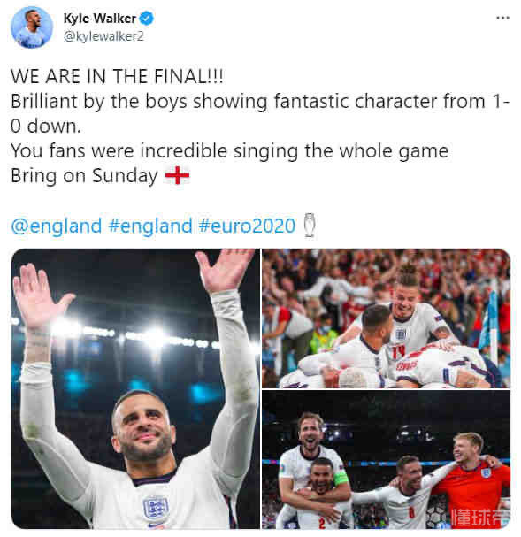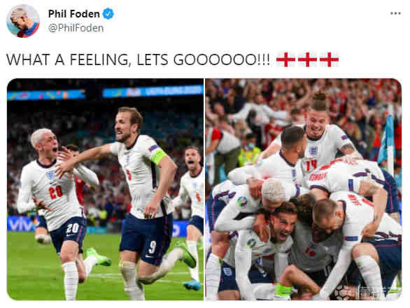赛后,曼城球星各自在个人社媒发文庆祝英格兰晋级决...天tian足球 @懂球帝2021-07-08 11:53赛后,曼城球星各自在个人社媒发文庆祝英格兰晋级决赛! 图一、斯特林:“最后一关!英格兰加油!” 图二、沃克:“我们进决赛了!伙伴们在0-1落后时的表现太出色了!全场始终为我们高歌加油助威的球迷们更是不可思议!星期天,放马过来吧!” 图三、福登:“多么(美妙)的感觉,让我们一起走下去!”展开更多