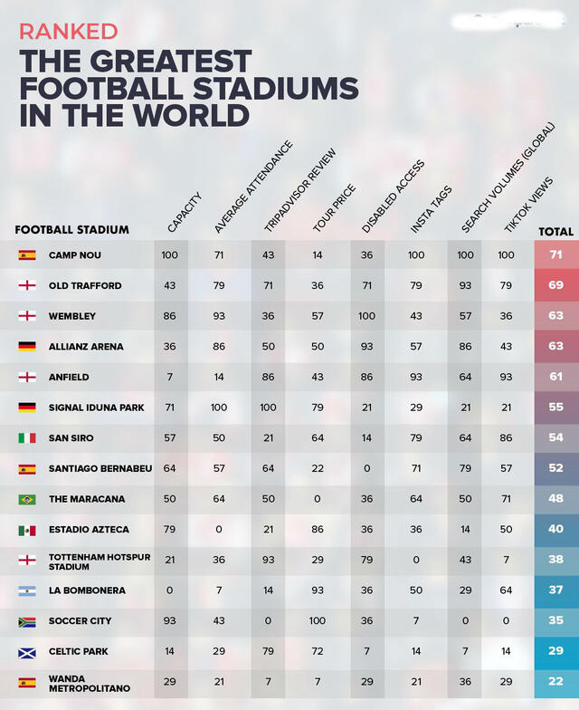 曼联主场老特拉福德位居诺坎普之后,排名次席。温布利位居第3位,随后是拜仁和利物浦的主场。