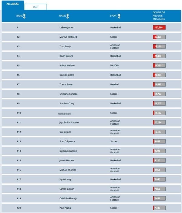 大师看天下近日,美媒pickswise公布了一项关于运动员在网络平台被言语攻击次数的排名。在足球领域,排名最高的不是梅西、C罗这种足坛顶流,而是曼联的前锋拉什福德。