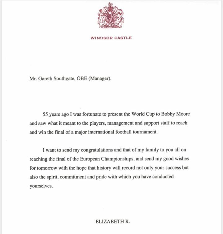 欧洲杯决赛前一天,英国女王伊丽莎白二世向英格兰主帅索斯盖特去信,祝他能率队夺得欧洲杯冠军。