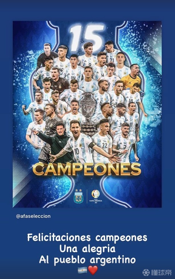巴内加晒阿根廷夺冠海报:祝贺冠军们,这是阿根廷人的快乐ETChalmers @懂球帝2021-07-11 21:43阿根廷击败巴西夺得美洲杯冠军,前国脚巴内加晒出夺冠海报,向全队送上祝贺。现年33岁的巴内加曾代表阿根廷出战三届美洲杯和一届世界杯,其中2015和2016年两届美洲杯阿根廷都倒在了点球大战。本届美洲杯,阿根廷最终击败巴西夺冠,夺得了暌违28年的大赛冠军。巴内加在个人社交媒体晒出阿根廷国家队官方夺冠海报,并写道:“祝贺冠军们,这是阿根廷人的快乐。”展开更多