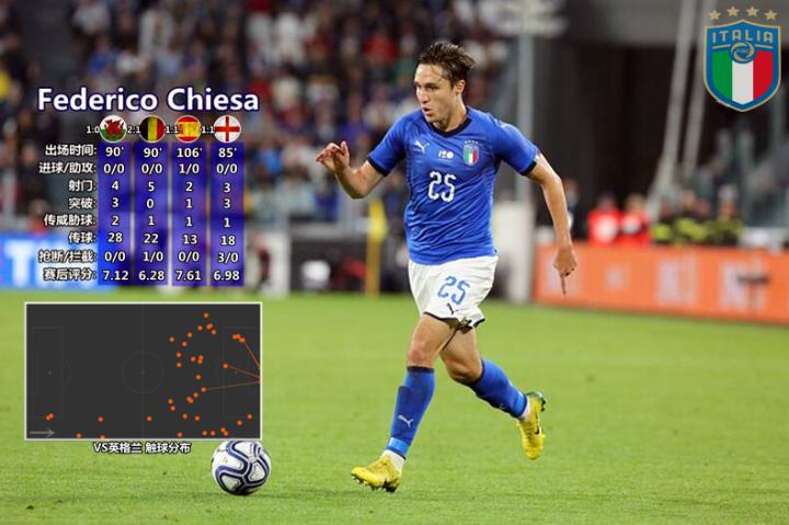闪电失球带来的心理波动,英式后卫带来的侵略性与压迫感,埃莫森失去了半决赛面对西班牙时的自信与灵动,意大利的左路进攻失去了创造力,只能依靠基耶萨的个人能力勉强维持局面。由于中场队友在转移球时过于求稳,身后的边后卫插上助攻的幅度也比较有限,基耶萨时常陷入以寡敌众的境地,表现努力却收效甚微。