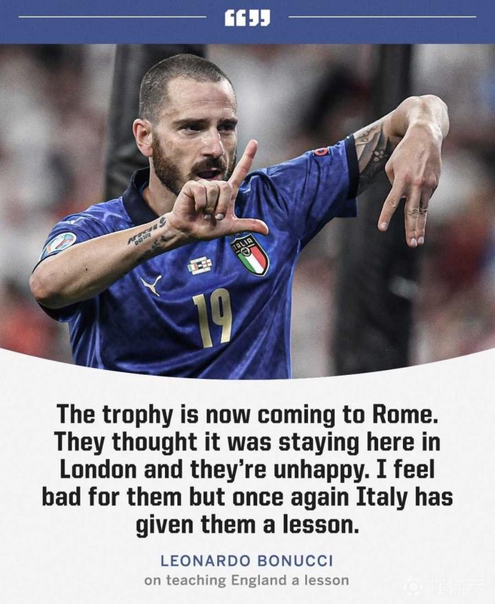 (espn)给年轻的“老板”上上课 博努奇更新社交媒体谈欧洲杯决赛, “欧洲杯奖杯现在就要送到罗马了。” “英格兰球迷曾认为它就该留在伦敦,所以现在就不高兴了。” “我为英格兰感到可惜,但意大利再次给他们上了一课。” "The trophy is now coming to Rome." "They thought it was staying here in London and they're unhappy." "I feel bad for them but once again Italy has given them a lesson." Leonardo Bonucci on teaching England a lesson. ESPN(来源) https://plus.espn.com/(地址)