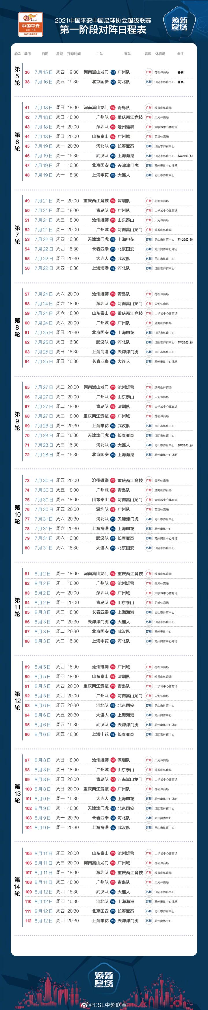 2021中国平安中国足球协会超级联赛第一阶段第5轮补赛、第6-14轮比赛对阵日程表正式公布。第5轮两场补赛将分别于7月15日和7月16日进行,第6-14轮比赛将于7月18日-8月12日进行。懂球帝将继续为大家带来本阶段的中超直播,敬请期待~