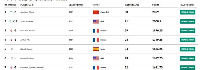 商竣程目前的积分为2359分,比排名第二的美国选手高出350分之多。2021年3月,商竣程完成了自己在ATP的职业首秀,此前他还在法网青少年比赛中打进男单八强。