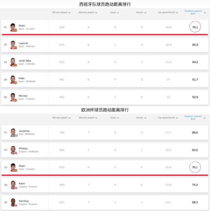 欧洲杯决赛开始之前,佩德里就牢牢占据本届欧洲杯球员跑动距离的榜首。纵观西班牙队内,佩德里更是以76.1公里的总跑动距离超出排名第二的拉波尔特十多公里。