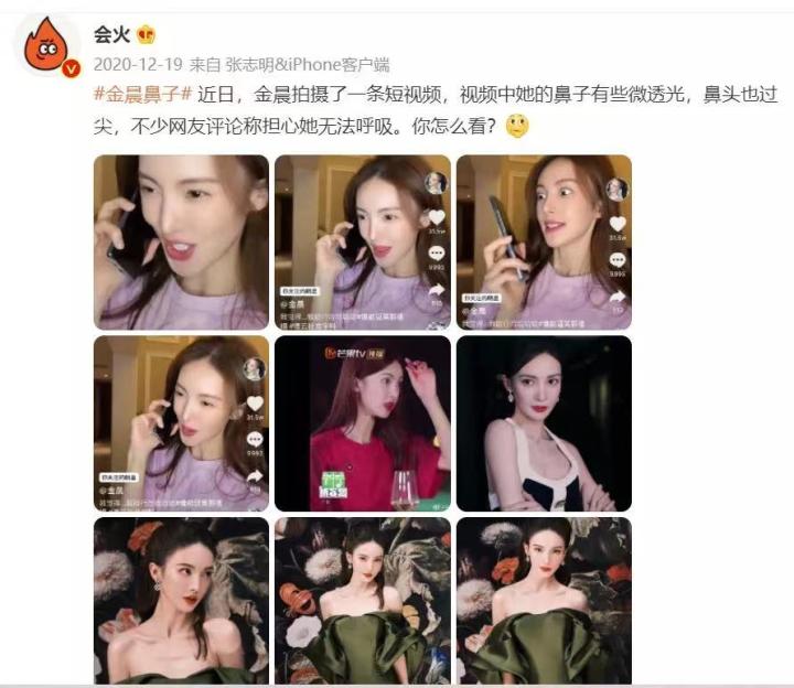 金晨也曾因为一组视频截图上过热门 ,从一些角度看,截图里她的鼻梁透光、鼻头过尖,于是被怀疑“整容过度、无法呼吸”。