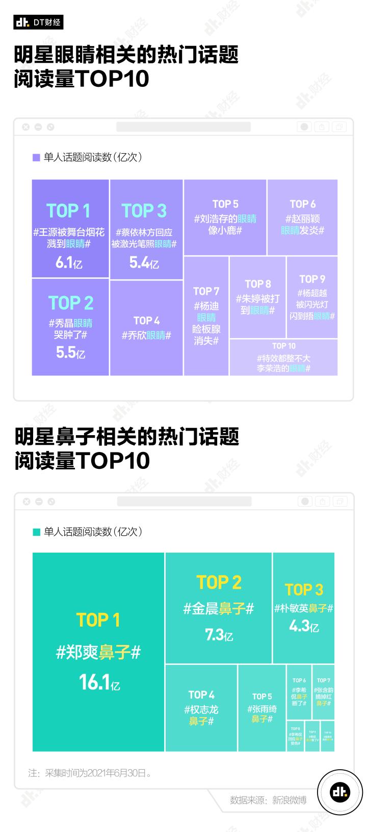 在DT君采集的所有话题中,以某身体部位相关的热门话题阅读量为标准,眼睛排在第一名。156条眼睛话题中有150条阅读量都超过了500万,热门比例为96.2%。但在所有热门话题中,#xxx的眼睛#这种形式只占18%,在明星眼睛话题阅读量TOP10中,有7条是明星的眼睛受到了伤害。