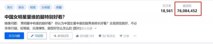 知乎问题“中国女明星里谁的腿特别好看”,一共被一万八千多人关注,浏览量达到了七千六百万多,镜像问题“中国男明星里谁的腿特别好看”浏览量则还不到十六万。