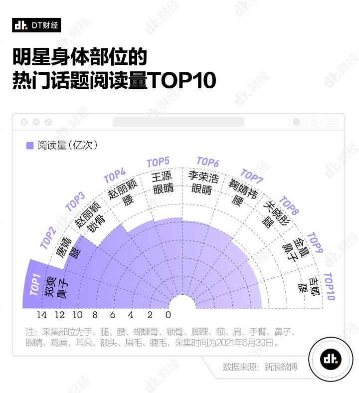 在本次统计中,DT君以九个身体部位(手、腿、腰、蝴蝶骨、锁骨、脚踝、颈、肩、手臂)和七个面部器官(鼻子、眼睛、嘴唇、耳朵、额头、眉毛、睫毛)为关键词,从新浪微博采集了相关的11138条话题信息,并从中筛选出与明星相关的部分。