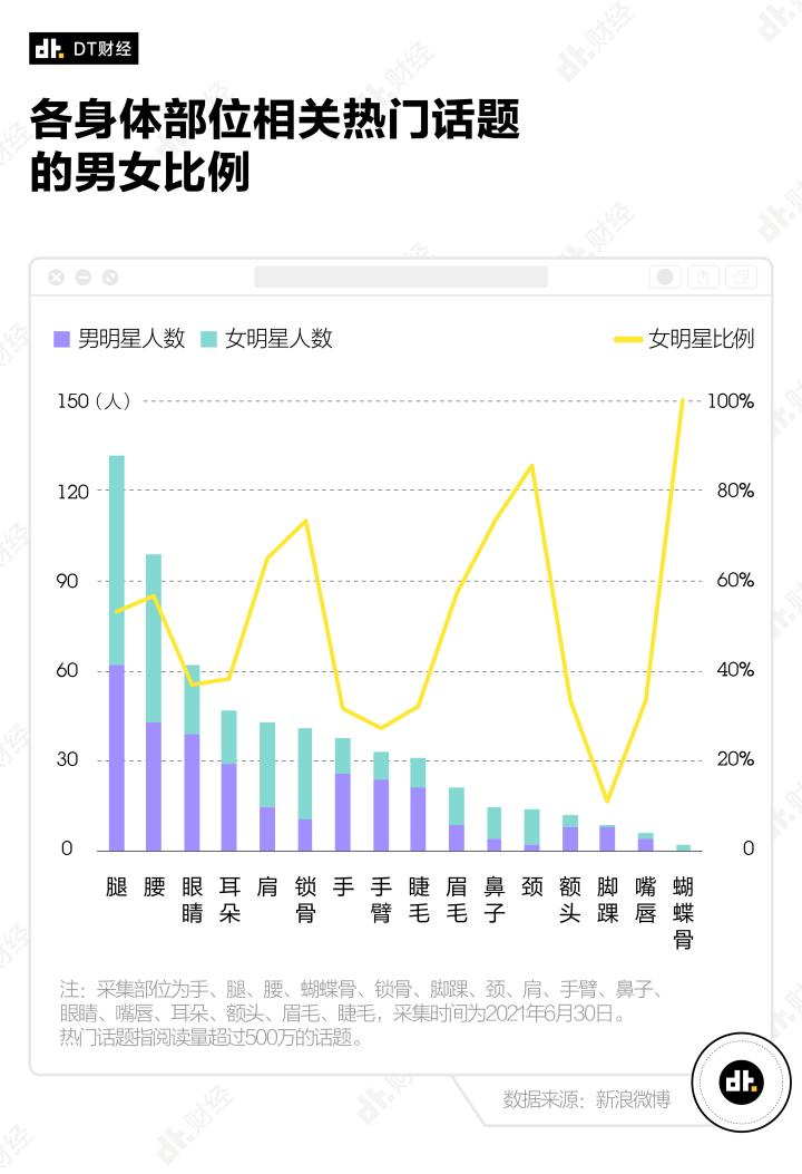 “体态”也是女明星的另一大战场。在这些热门话题中,与体态相关话题,主角都以女明星居多,在颈、锁骨、肩的热门话题中,女明星比例都超过了三分之二。