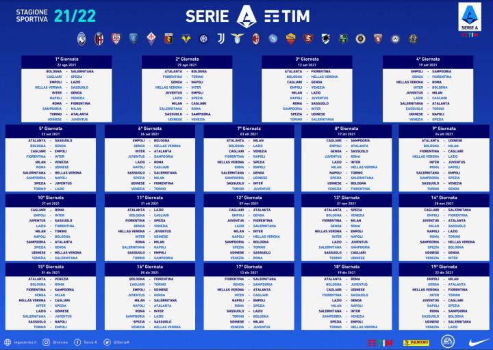 21/22赛季意甲赛程:揭幕战于8月22日进行,11月初迎米兰德比