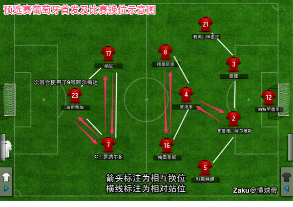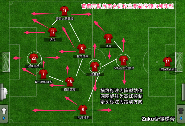 而在首次两回合比赛的阵地进攻中葡萄牙的边路小集团设置是非常明显的。虽然两个边路小集团的人员构成数量一致,但是具体的技战术打法却完全不同。