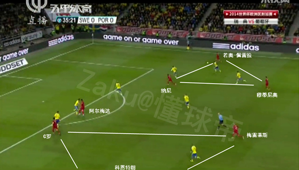在首回合葡萄牙主场同瑞典的附加赛中面对收缩防守的瑞典队时,葡萄牙的阵型其实像是一个中后卫位置很靠后的4-5-1,有时阿尔维斯的拖后甚至站到已经和佩佩平行站位的维罗索后面,而两个边后卫又会跑到穆蒂尼奥和梅雷莱斯前面,这个时候的阵型有些2-3-2-3的感觉。