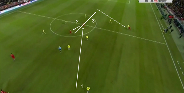 对于右路来讲,一般进攻的发起点是佩佩,佩佩直接找到站位非常靠前的佩雷拉,这个时候穆蒂尼奥和纳尼会来到佩雷拉身边进行撞墙配合。