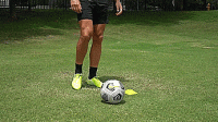 在第一个练习中,我们用脚掌把球拉过来,用同一只脚的内侧把球推过空当,然后我们用另一只脚的内侧向前推。