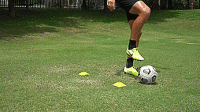 所以我们用脚底把球拉过来,用脚外侧触球穿过标志盘,然后用同一只脚的脚内侧向前推,拉回来到最后一个标志盘,脚外侧触球穿过,再推球向前,从两个方向重复。