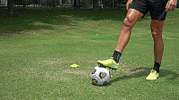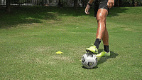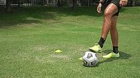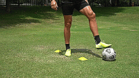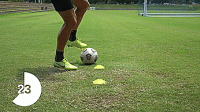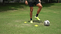 在最后的练习中,我们要在标志盘周围画一个8字形,这次是从侧面开始,我们把球拉回来,向内推穿过标志盘,用另一只脚往前推,绕过下一个标志盘。