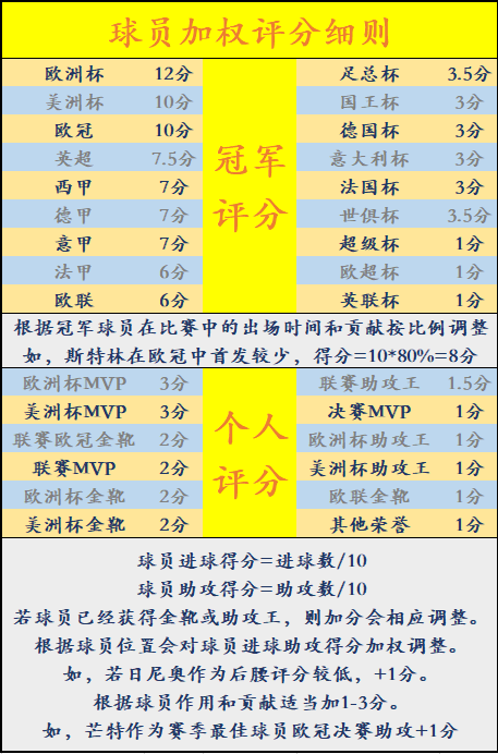 附:加权评分细则(注:加权评分只是笔者对金球奖排名的一项参考,冠军和个人奖项的分值是笔者的主观考量,笔者并未完全按照评分多寡进行金球奖排名,因此并未列出每个球员具体评分,如有需要球员最终得分或不同意评分细则的请评论说明。)